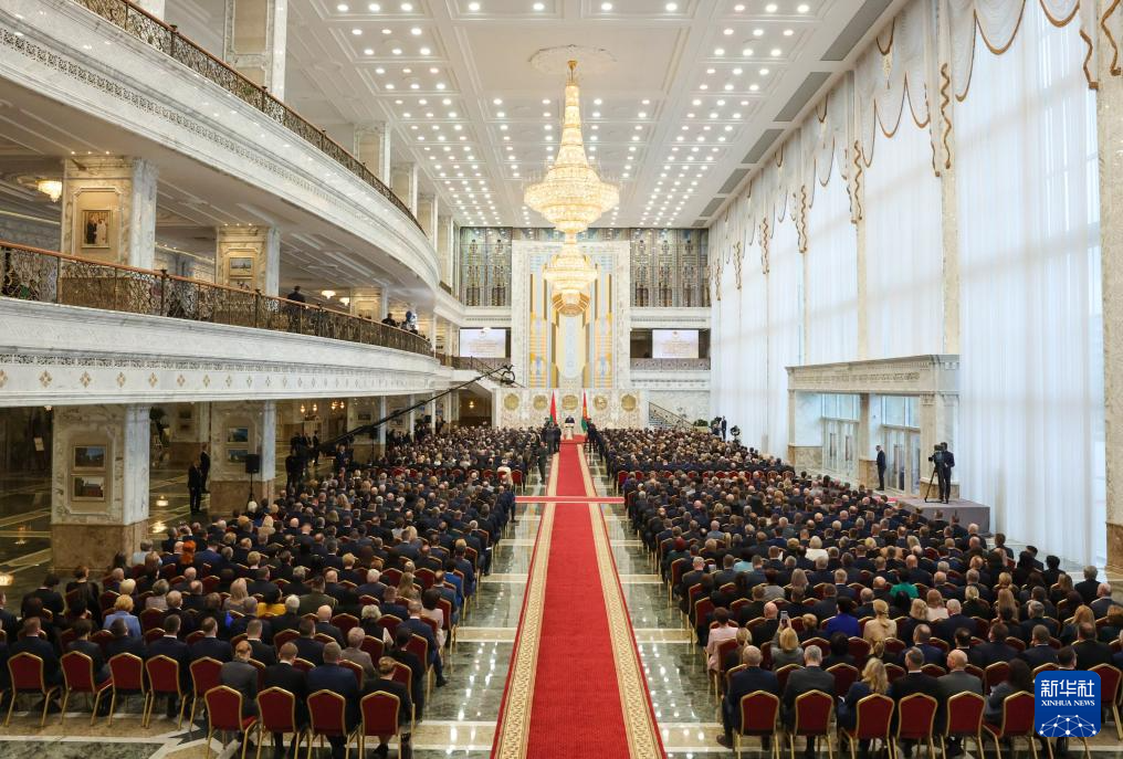 這是3月25日在白俄羅斯首都明斯克獨立宮拍攝的總統盧卡申科宣誓就職現場。新華社/白通社