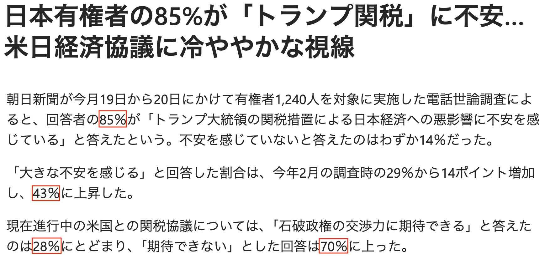 另據(jù)日本《朝日新聞》19日至20日進(jìn)行的民調(diào),多達(dá)85%的日本受訪者擔(dān)憂特朗普政府的關(guān)稅會對日本經(jīng)濟(jì)產(chǎn)生負(fù)面影響,其中43%的受訪者表示非常擔(dān)憂。
