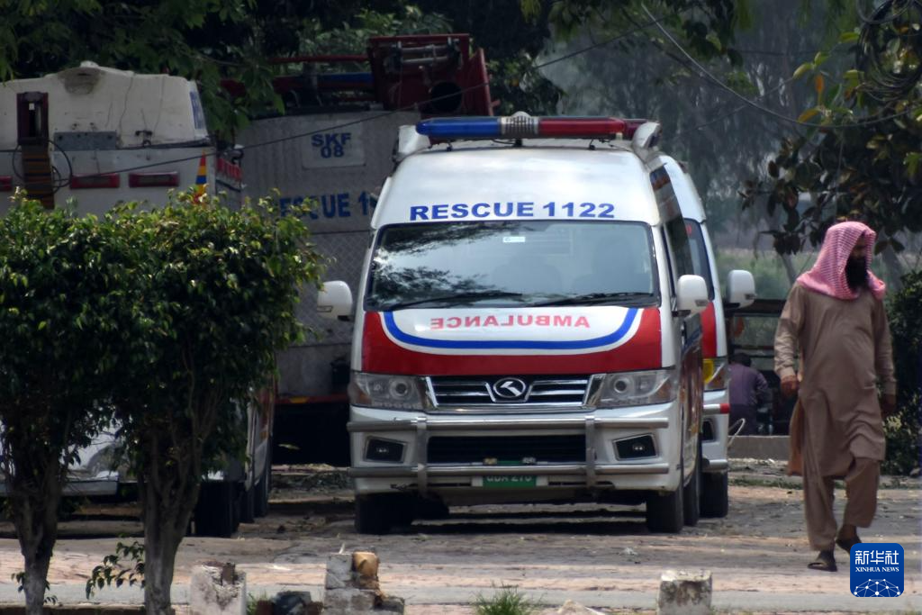 5月7日,救護車停在巴基斯坦東部旁遮普省謝赫布拉地區穆里德蓋鎮遭印度導彈破壞的建筑附近。新華社發(薩賈德攝)