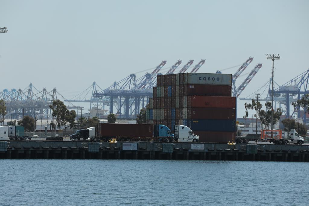 這是4月29日在美國洛杉磯港拍攝的集裝箱和卡車。洛杉磯港執行董事吉恩·塞羅卡當天表示,隨著美國關稅政策導致企業削減進口訂單,洛杉磯港下周入境貨運量預計將比去年同期下跌超過35%。新華社發(邱晨攝)