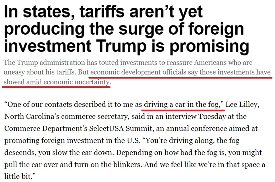 美國政府一直宣稱,加征關稅將為美國吸引數萬億美元的外國投資。但據美國《政治報》報道,來自美國多個州的政府官員和議員都抱怨說,白宮關稅政策引發的不確定性正在阻礙外資進入美國市場。