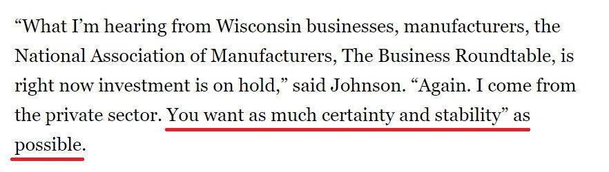 “我從本州的企業、制造商以及全美制造商協會和商業圓桌會議那里聽到的消息是,許多外商原定的投資計劃已經被擱置。我本人來自私營企業,我知道企業最需要的就是盡可能多的確定性和穩定性。”