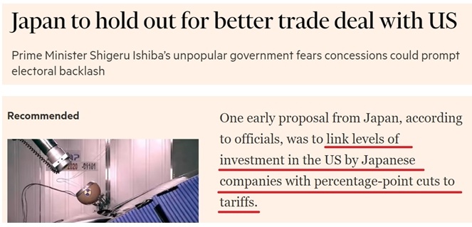 另據報道,考慮到日本是美國最大海外投資來源國,日方除考慮進一步對美開放市場等讓步條件外,早期談判方案中還包括將美國對日商品關稅減免的百分點與日本企業在美投資水平掛鉤。