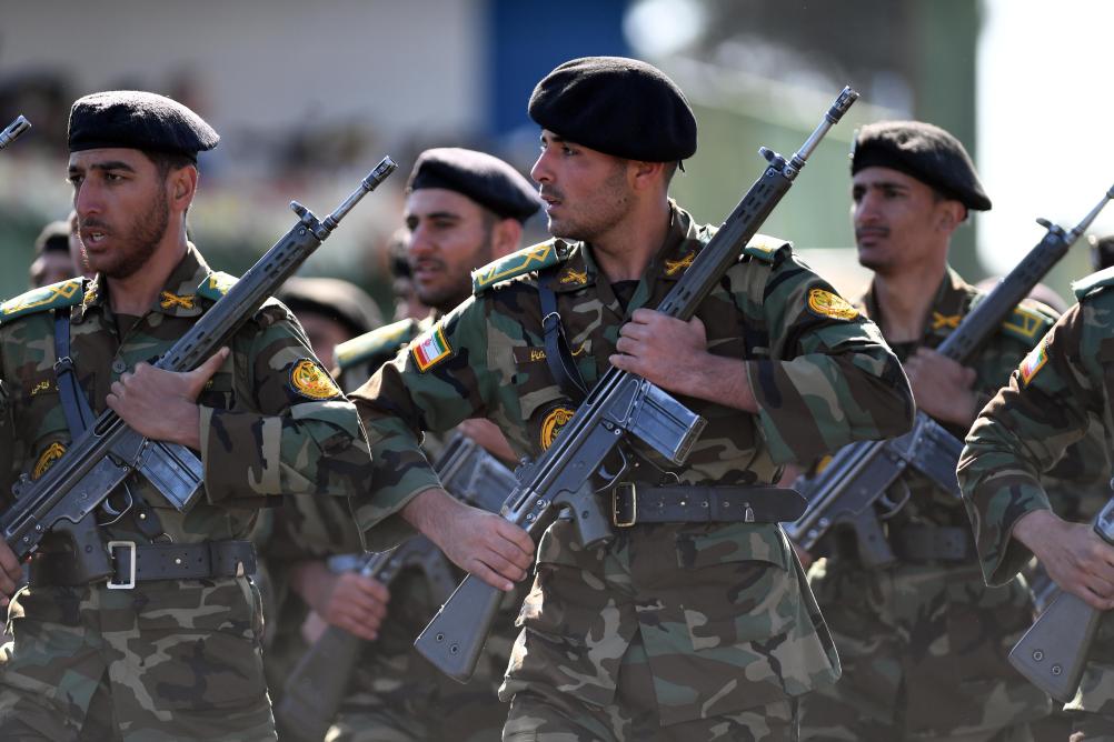 2025年4月18日,在伊朗首都德黑蘭,士兵們在閱兵式上列隊行進。伊朗18日舉行建軍節閱兵式。新華社記者 沙達提 攝