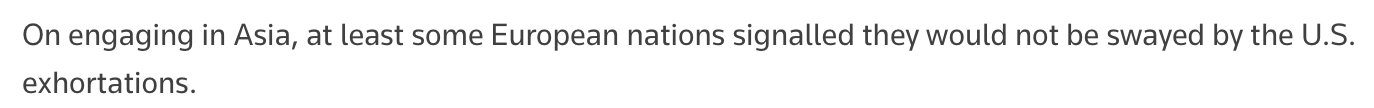 文章注意到歐盟外交與安全政策高級代表卡婭·卡拉斯的發言,稱她似乎將歐盟定位為亞洲富有成效的合作伙伴。她認為,亞洲或許可以成為一種新選擇,以應對美國如今的日益反復無常、奉行保護主義,以及不再重視基于規則的國際秩序。