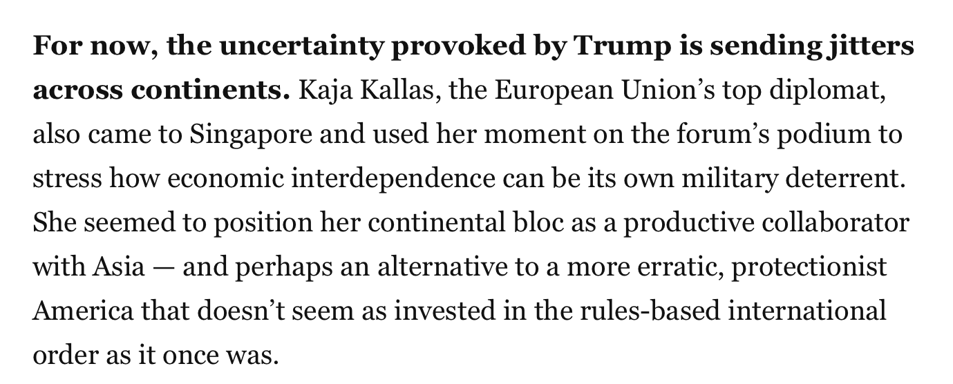 《華盛頓郵報》的一篇文章則通過香格里拉對話會觀察到,美國政府濫施關稅引發的不確定性,正讓各大洲陷入不安。