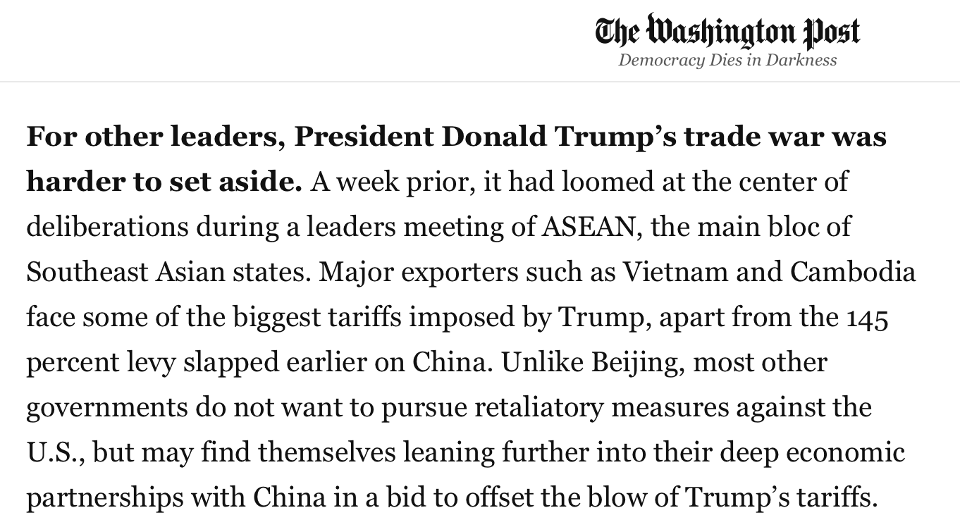 文章說,盡管大多數亞洲國家的政府沒有對美國采取反制措施,但它們都更傾向于進一步鞏固與中國的深厚經濟伙伴關系,以抵消美國關稅帶來的沖擊。