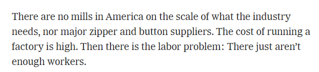 文章說,特朗普政府的高額關(guān)稅給企業(yè)帶來了巨大壓力,迫使企業(yè)的負(fù)責(zé)人一直在思考自己能在美國多生產(chǎn)多少產(chǎn)品。但是,美國既沒有滿足該行業(yè)需求的規(guī)模工廠,也沒有主要的拉鏈和紐扣供應(yīng)商。運(yùn)營工廠的成本很高。此外還有勞動(dòng)力問題:工人根本不夠用。