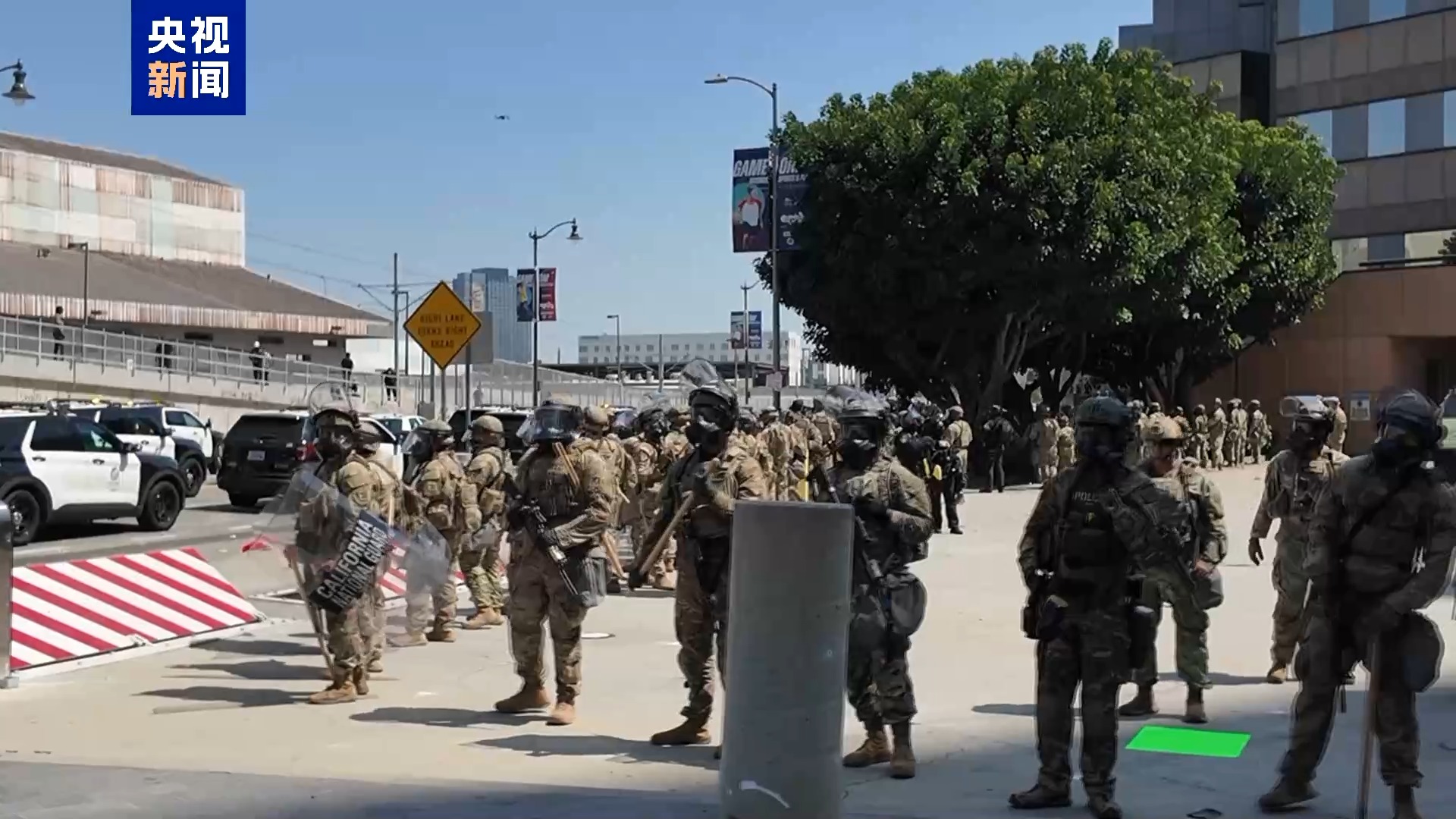 央視記者 劉驍騫:同時,美國國民警衛隊已部署在現場。這些荷槍實彈穿著迷彩服的士兵就是特朗普政府部署的國民警衛隊隊員,他們在幾個小時前,也就是當地時間8日上午入駐到這里。根據官方消息,目前已經有至少300名國民警衛隊隊員抵達洛杉磯。