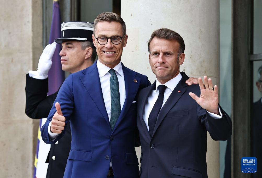 9月4日,在法國(guó)首都巴黎的總統(tǒng)府愛麗舍宮,法國(guó)總統(tǒng)馬克龍(右)迎接出席“志愿聯(lián)盟”線上會(huì)議的芬蘭總統(tǒng)斯圖布。新華社記者 高靜 攝