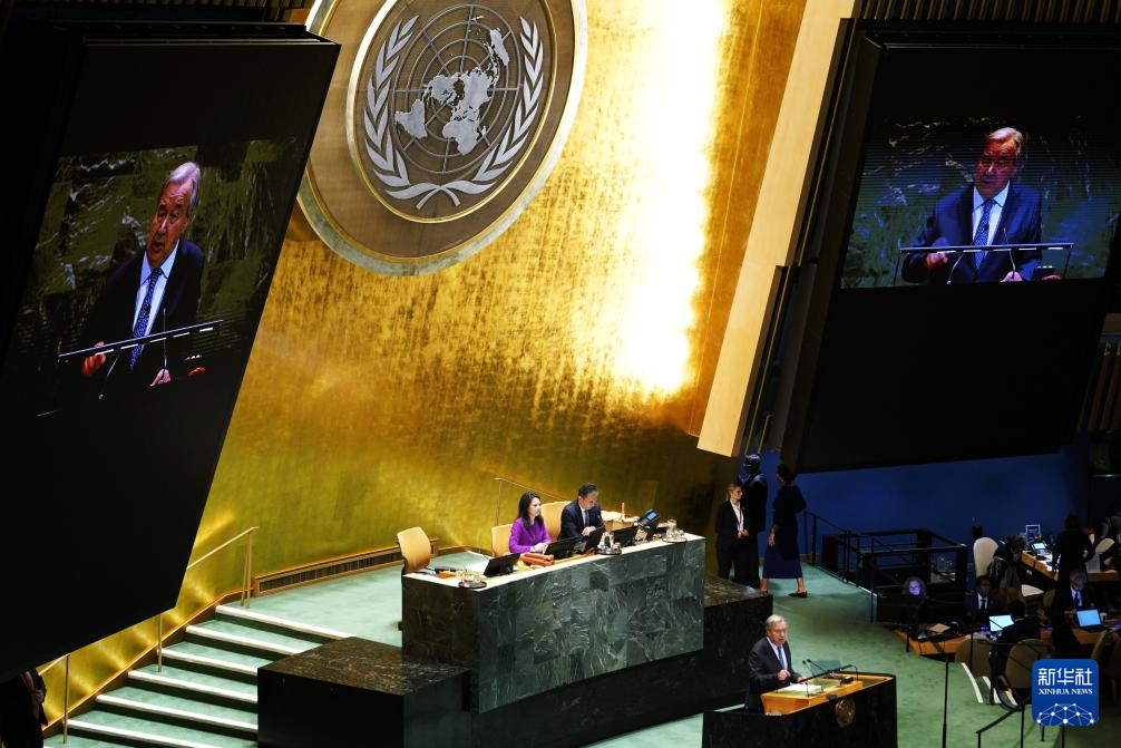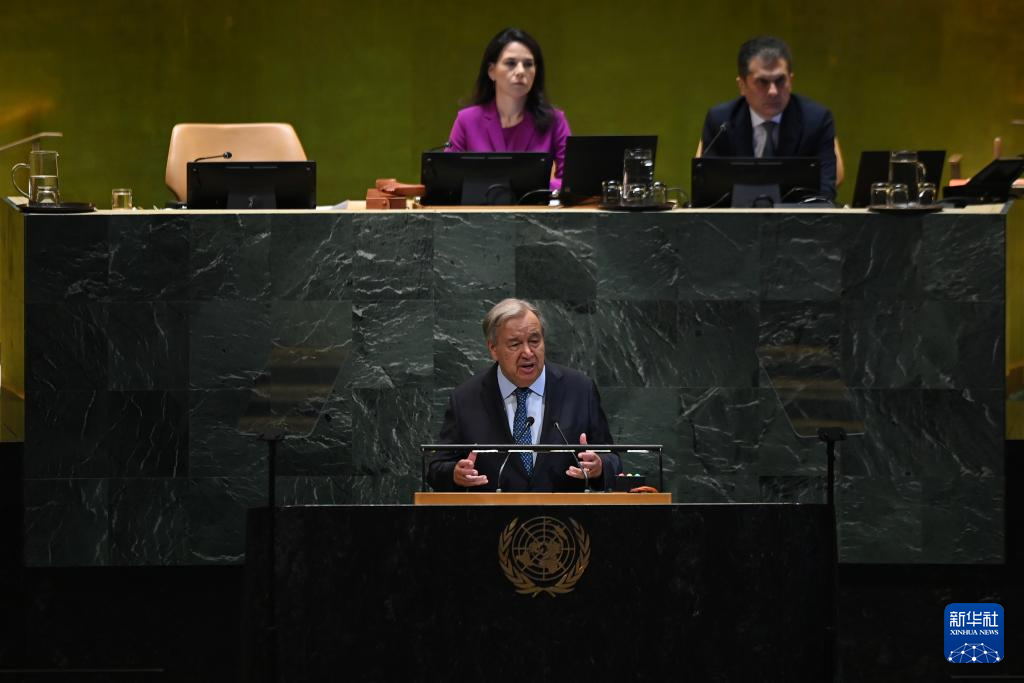 9月23日,在位于紐約的聯合國總部,聯合國秘書長古特雷斯在第80屆聯合國大會一般性辯論開幕式上致辭。新華社記者李睿攝