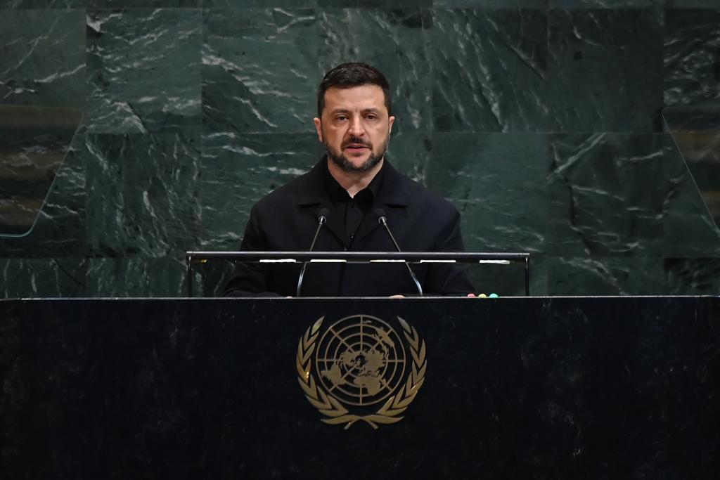 9月24日,在位于紐約的聯合國總部,烏克蘭總統澤連斯基在第80屆聯合國大會一般性辯論上發言。新華社記者李睿攝