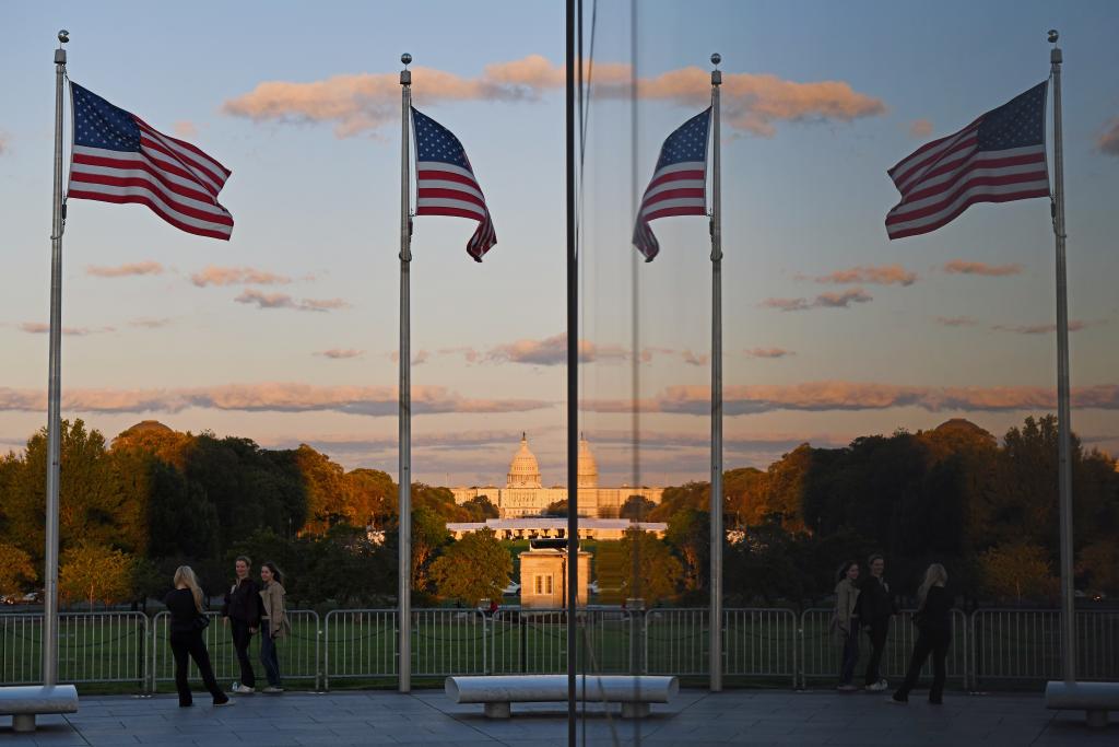10月8日,在美國華盛頓,人們以國會大廈為背景留影。新華社記者李睿攝