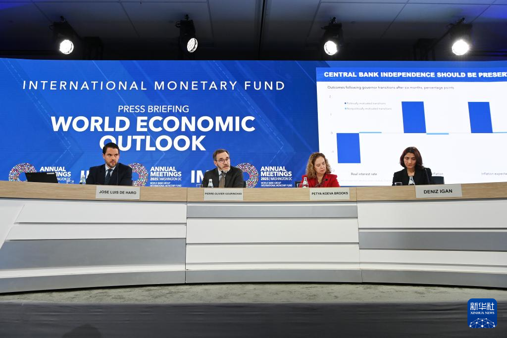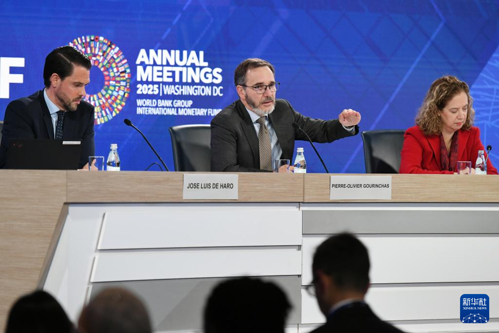 10月14日,在美國華盛頓,國際貨幣基金組織首席經濟學家皮埃爾-奧利維耶·古蘭沙(中)在《世界經濟展望報告》新聞發布會上講話。新華社記者 李睿 攝