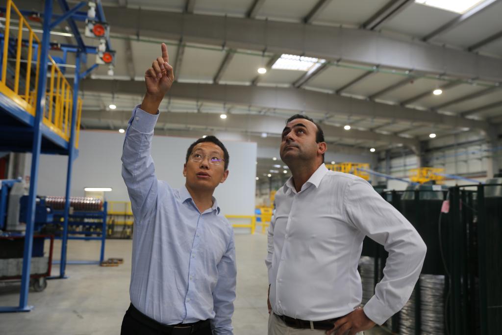 10月3日,在葡萄牙北部奧瓦爾市,亨通集團駐葡萄牙的設備經理劉建龍(左)與阿爾科夫雷電纜廠首席運營官卡洛斯·格蘭雅討論技術問題。新華社記者荀偉攝