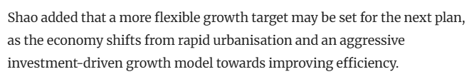 《南華早報》援引分析人士的表述認為,隨著中國經濟從快速城鎮化和投資驅動型增長模式轉向高質量發展,中國下一個五年規劃可能會設定更靈活的增長目標。