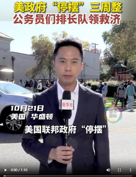 21日,美國聯邦政府“停擺”已整整三周。當天午間,新華社記者在首都華盛頓東郊一處救濟點看到,被拖欠工資的聯邦雇員排起了數十米長隊,領取免費食品以解“燃眉之急”。