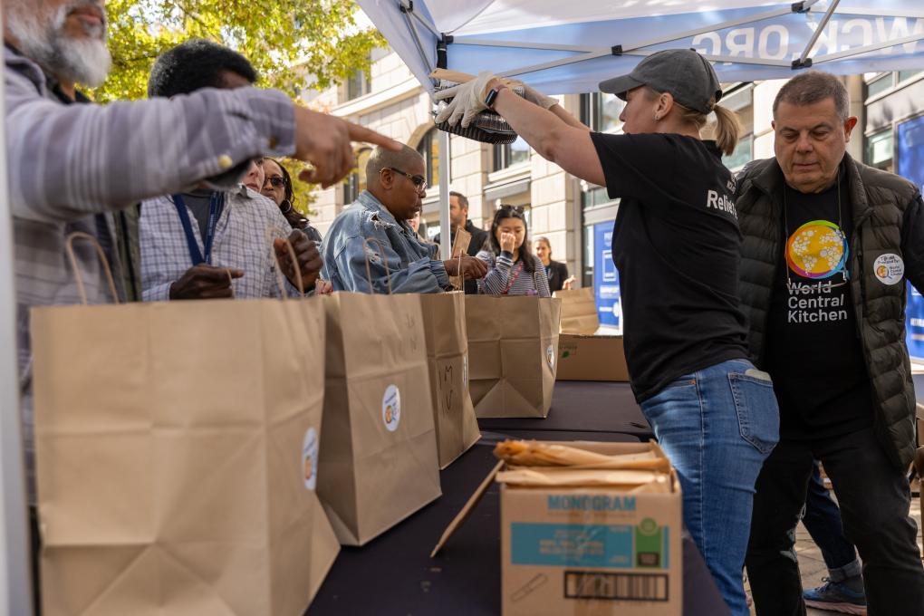 11月5日,在美國(guó)首都華盛頓,聯(lián)邦雇員排隊(duì)領(lǐng)取免費(fèi)食物。新華社記者胡友松攝