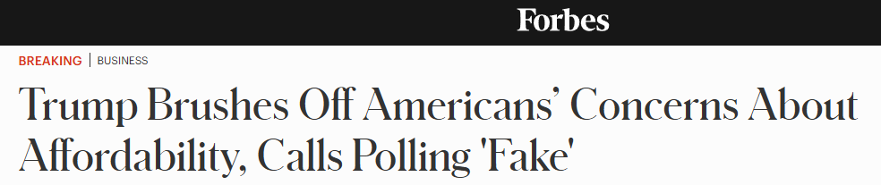 福布斯新聞網站報道稱,本月早些時候的調查顯示,超過四分之三的美國人對個人財務狀況感到憂慮,而政府卻質疑民調的真實性,稱其為“虛假信息”。然而,多數民眾正經歷的是物價上漲帶來的支出增加。盡管特朗普政府宣稱“生活成本已大幅下降”,但電費、家具、電子產品及食品雜貨等價格自其就職以來便普遍上漲。