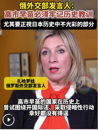 今年是世界反法西斯戰爭勝利80周年。扎哈羅娃指出,世界各地一系列紀念活動都在提醒世人勿忘歷史、汲取教訓。高市早苗必須牢記歷史教訓,尤其要正視本國歷史中那些不光彩的部分。