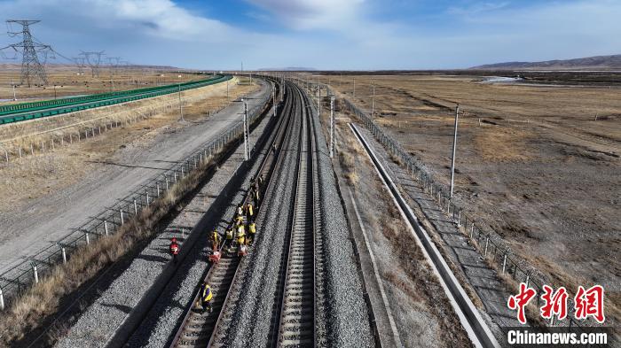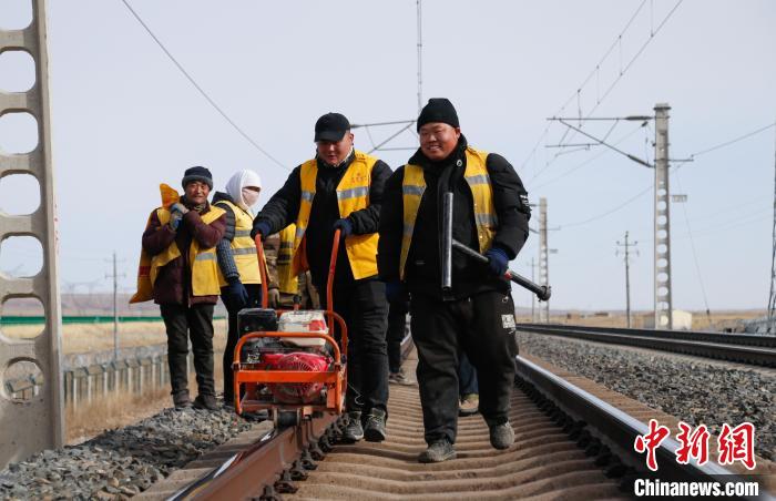 1月22日,北方小年,中國鐵路青藏集團有限公司德令哈工務段關角隧道工區“00后”職工郝斌(中),在天窗作業(為鐵路維修養護,施工預留的時間段)過程中用力將壓機甩入鐵路鋼軌底部,整治線路凍害。郝斌所在的工區位于青海省海西蒙古族藏族自治州天峻縣境內的新關角隧道,平均海拔3600米,是青藏鐵路的“咽喉要道”,也是世界高海拔鐵路第一長隧。乙巳蛇年春節,郝斌和他的11名同事將堅守崗位,守護“天路”。“雖然無法和家人團聚,但想到旅客能從我工作的線路上平安回家,我就感到自豪,工作也更有干勁。”郝斌說,這是他在工區度過的第二個春節。中新社記者 馬銘言 攝