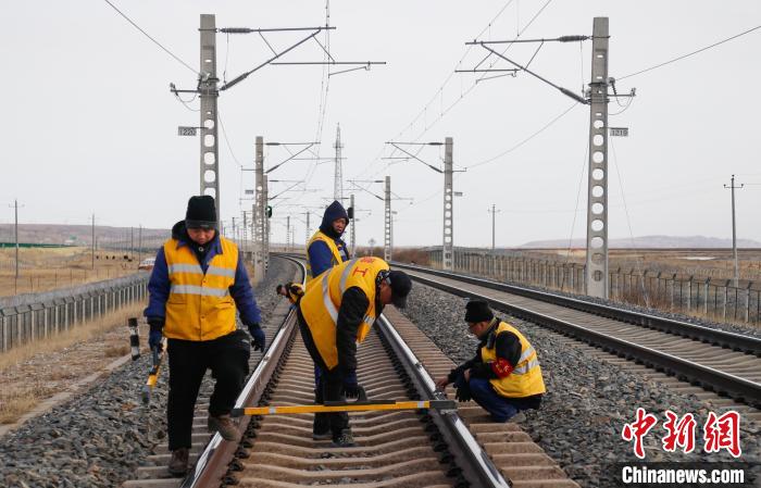 1月22日,北方小年,中國鐵路青藏集團有限公司德令哈工務段關角隧道工區“00后”職工郝斌(中),在天窗作業(為鐵路維修養護,施工預留的時間段)過程中使用電子道尺測量鋼軌幾何尺寸。中新社記者 馬銘言 攝