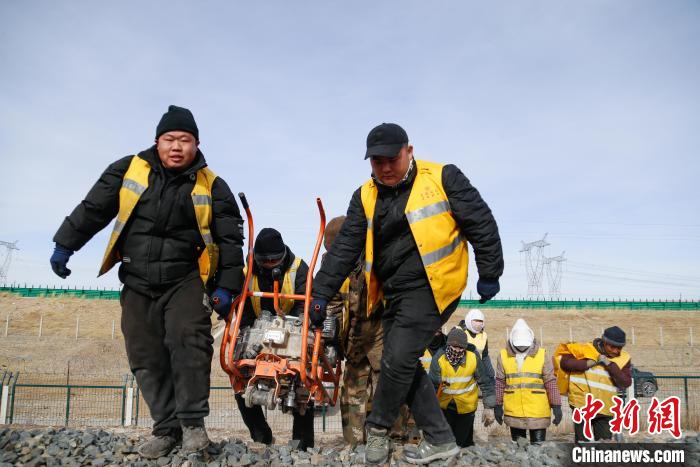 1月22日,北方小年,中國鐵路青藏集團有限公司德令哈工務段關角隧道工區“00后”職工郝斌(右)、趙鵬舉(左),在天窗作業(為鐵路維修養護,施工預留的時間段)過程中合力將螺絲機抬上線路。中新社記者 馬銘言 攝