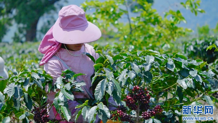 咖農采摘咖啡鮮果(資料圖)。新華網發(保山市委宣傳部 供圖)