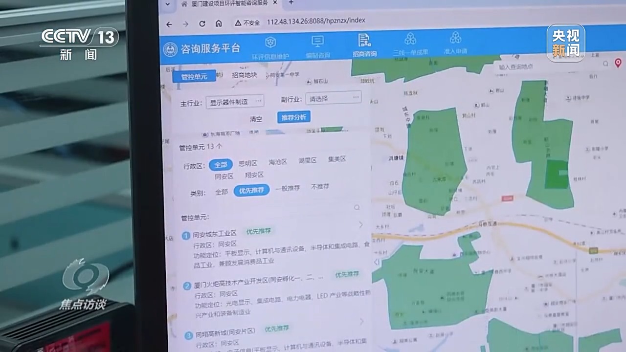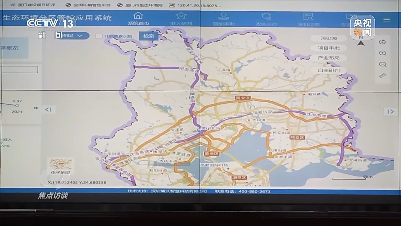 福建廈門市生態環境局環評處處長 詹源:我們在系統里面融入了國土空間、市政設施、產業布局以及生態環境,一共有207個矢量圖層,在這里面可以查看到空間信息、污水管網設置、產業布局規劃等信息。同時,我們還梳理了10萬多條準入條件,形成了分區管控的智慧內核。