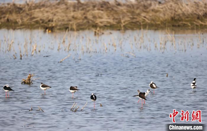 成群黑翅長腳鷸,它們時而緩慢涉水行走,時而自由飛翔,構(gòu)成春日里一幅靈動的生態(tài)畫卷。