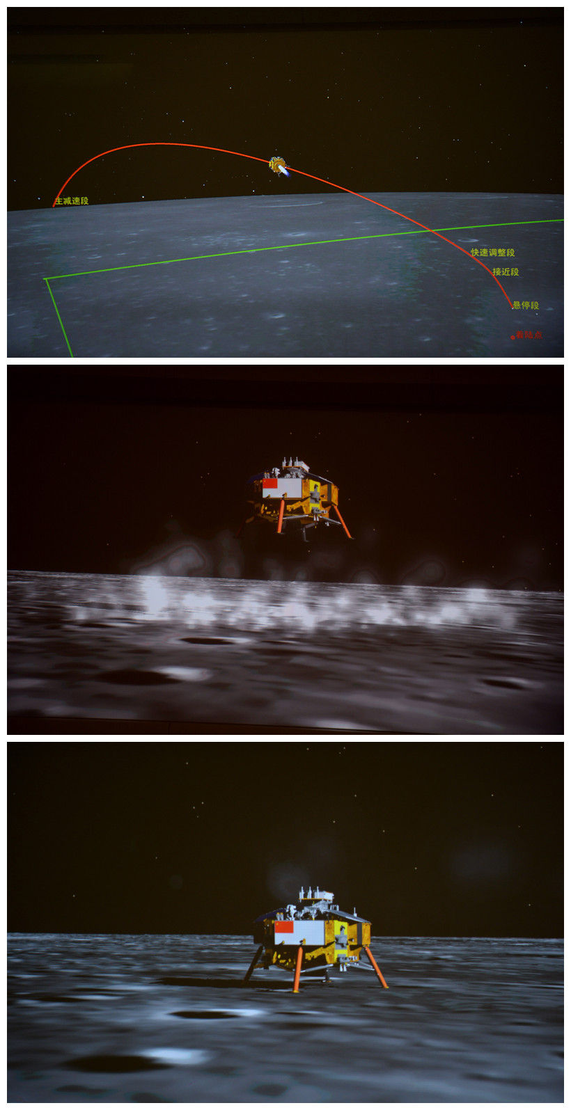 這是2019年1月3日在北京航天飛行控制中心拍攝的降落過程(示意圖)。2019年1月3日10時26分,嫦娥四號探測器自主著陸在月球背面南極-艾特肯盆地內的馮·卡門撞擊坑內,實現人類探測器首次在月球背面軟著陸。新華社記者 金立旺 攝