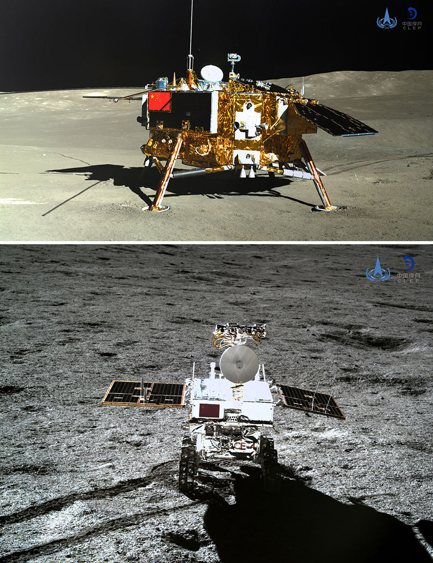 2019年1月11日下午,嫦娥四號著陸器與玉兔二號巡視器工作正常,在“鵲橋”中繼星支持下順利完成互拍(拼版照片)。新華社發(國家航天局供圖)