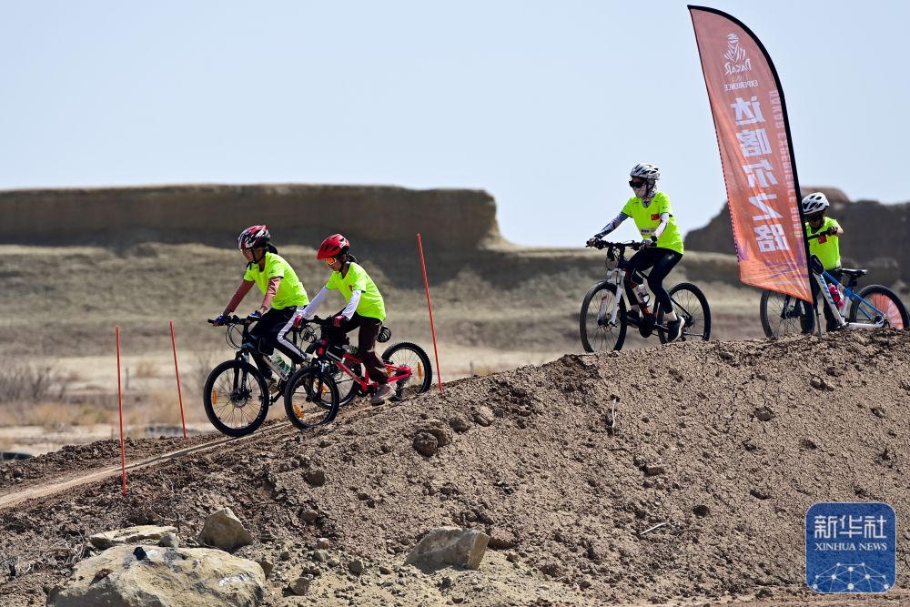 在新疆克拉瑪依市烏爾禾區世界魔鬼城景區,小朋友們在自駕線路上體驗自行車越野(5月1日攝)。