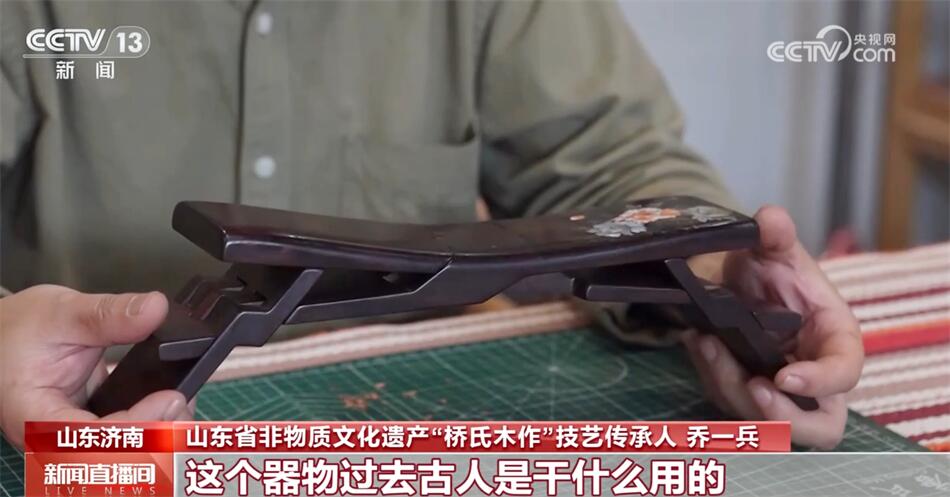 山東省非物質(zhì)文化遺產(chǎn)“橋氏木作”技藝傳承人喬一兵介紹:“它本身是一整塊木頭六個(gè)面,通過鋸和鑿形成一個(gè)器物。這個(gè)器物過去古人是干什么用的?當(dāng)枕頭用的,也可以當(dāng)?shù)首佑茫畲蟮奶攸c(diǎn)是可以折疊,攜帶非常方便,傳說是魯班發(fā)明的。和眾多的優(yōu)秀的傳統(tǒng)技藝一樣,它深層次代表的是中國的一些思想、一些哲學(xué)、一些文化在里邊,魯班枕的核心是平衡和和諧,我覺得我很有必要把它傳承下來,發(fā)揚(yáng)光大。”