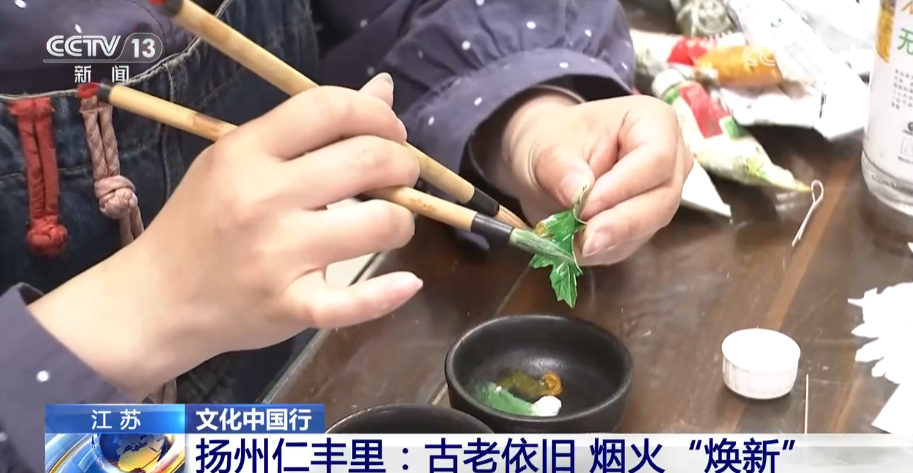 總臺央視記者 楊威:將傳統的非遺技能進行適合現代生活的活化式展現,是仁豐里非遺呈現的一大特色。像作為江蘇省級非遺的揚州通草花制作技藝,已經有了超過兩千年的歷史,以前只是專攻于宮廷,如今在這里您可以近距離地觀賞手藝人們現場制作的技巧,也可以親自上手做一個屬于自己的通草花帶回家。