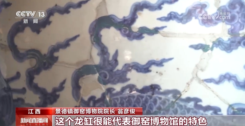 景德鎮御窯博物院院長 翁彥俊:我們的所有的展品都來自于我們身后的御窯廠,通過考古挖掘出來的。當年御窯對落選品的處理制度非常嚴格,不合格的就要打碎還集中掩埋,所以我們能夠發現這么多的碎片,并且能夠把它拼對出來。這個龍缸很能代表御窯博物館的特色。