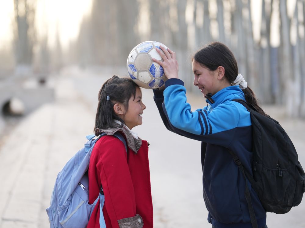 賽麗瑪很穩重,賽比熱則是姐姐快樂的“小尾巴”,因為姐姐踢球,她也耳濡目染地開始練習。“我進足球隊的時候很弱,然后練了很多次帶球、鏟球之類的,我就更加堅強了。”她的小圓臉上帶著幾分驕傲,“在班里搬桌子的時候,我一搬桌子,桌子就會走。”