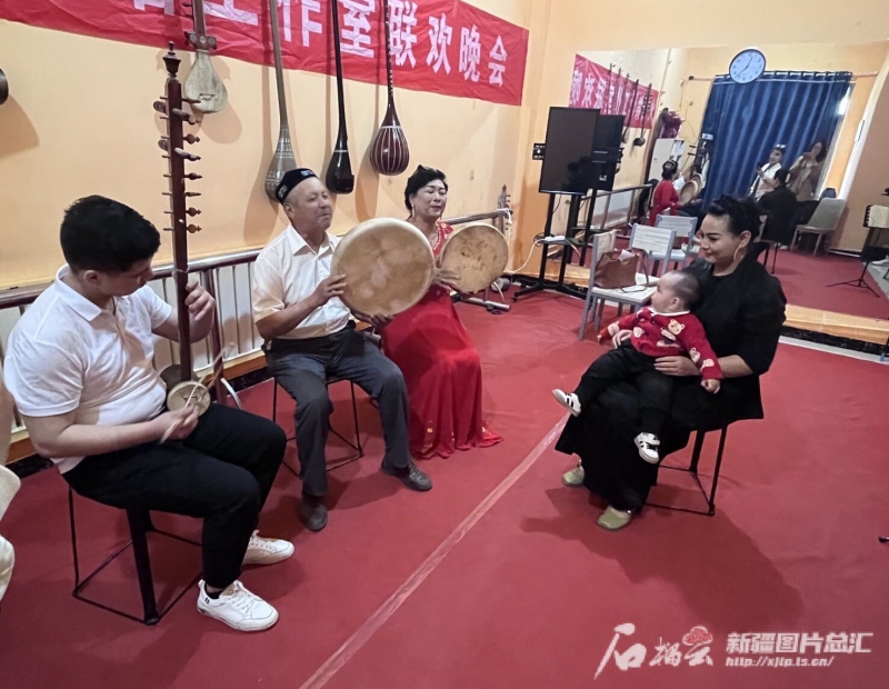 在哈密市非物質文化遺產保護中心,回城鄉的傳承人們和當地演員進行哈密木卡姆表演。石榴云/新疆日報記者 王晶晶攝
