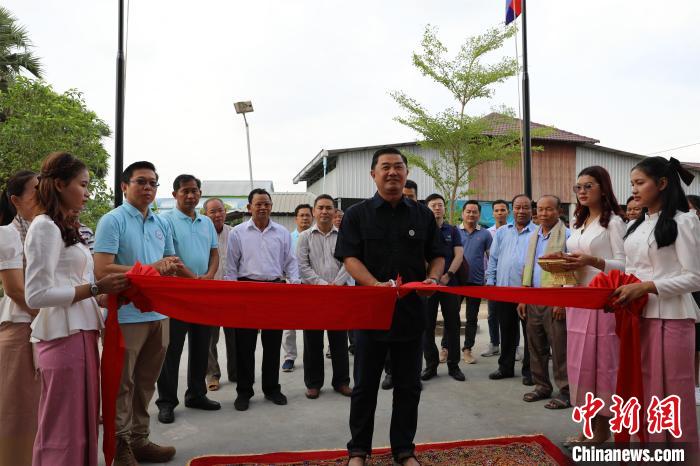 當?shù)貢r間5月12日,柬埔寨民間社會組織聯(lián)盟論壇主席蓋里維希為新落成的村民中心剪彩。中新社記者 楊強 攝