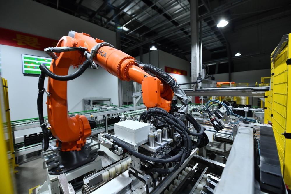 在廣西柳州市一家新能源汽車電池生產企業,機器人在生產線上作業(2023年5月10日攝)。新華社記者黃孝邦攝