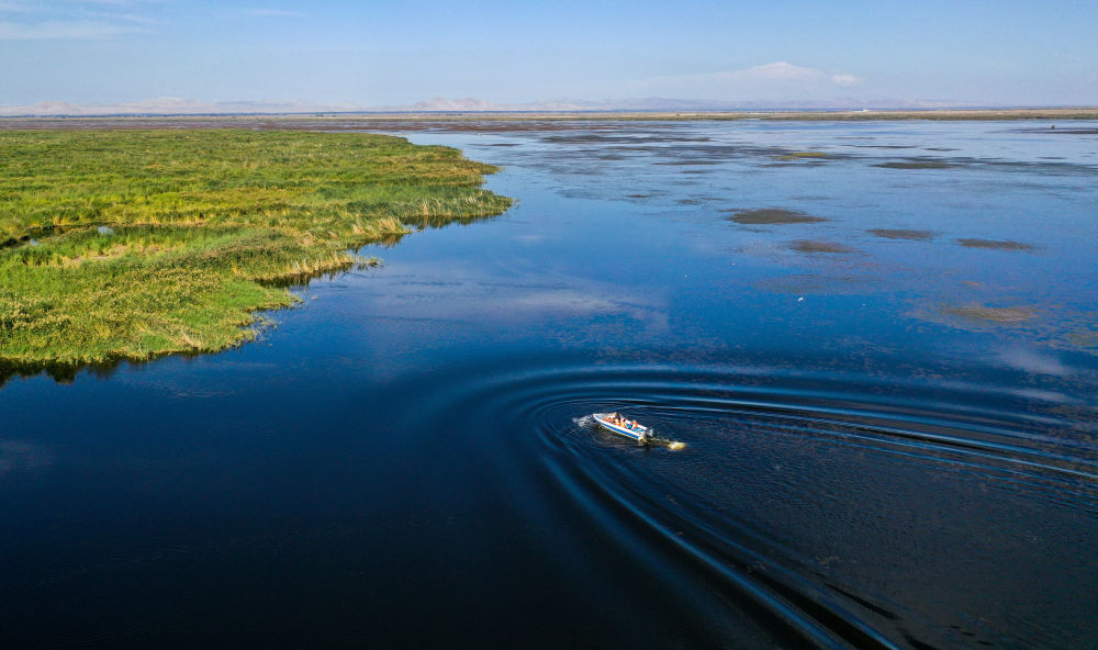 在內(nèi)蒙古烏梁素海湖面上,河湖濕地水環(huán)境保護(hù)與修復(fù)技術(shù)研究團(tuán)隊(duì)成員乘坐快艇去采集湖水樣本(2023年9月15日攝,無人機(jī)照片)。