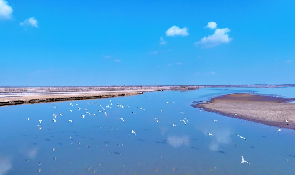 在黃河寧夏段,候鳥在灘涂上空飛翔(2024年3月1日攝,無人機(jī)照片)。