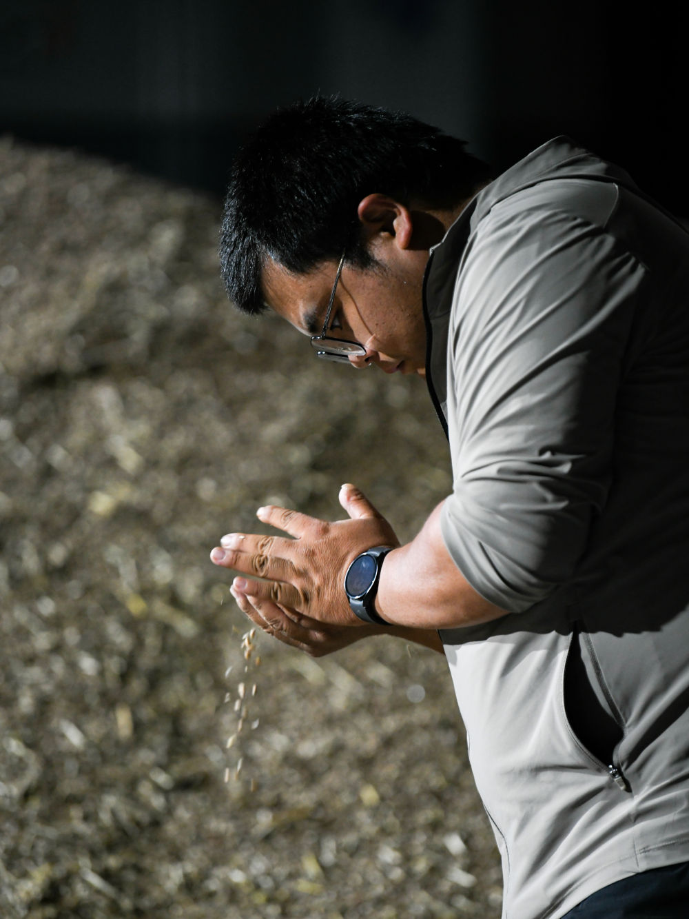 在四川成都崇州市萬茂欣欣農(nóng)機(jī)專業(yè)合作社,舒星宇在查看庫房待烘干小麥的情況(5月15日攝)。