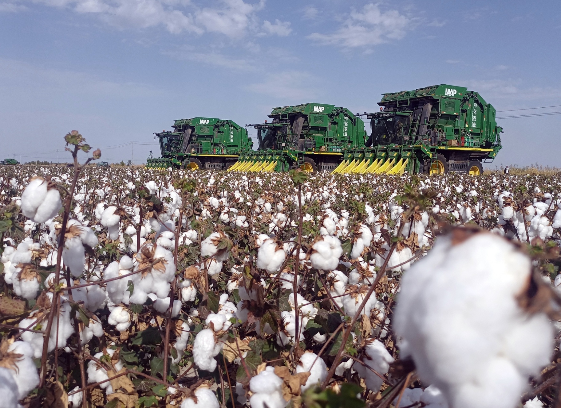 新疆塔城,采棉機采收沙灣市老沙灣鎮(zhèn)老沙灣新村向陽農(nóng)業(yè)專業(yè)合作社的棉花。