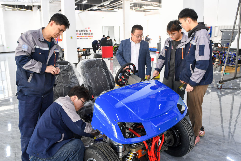 2024年3月13日,長春市麥迪克智行汽車科技有限公司,吉林大學汽車工程學院教授靳立強(右三)與同事檢查智能底盤樣車。新華社記者 張楠 攝