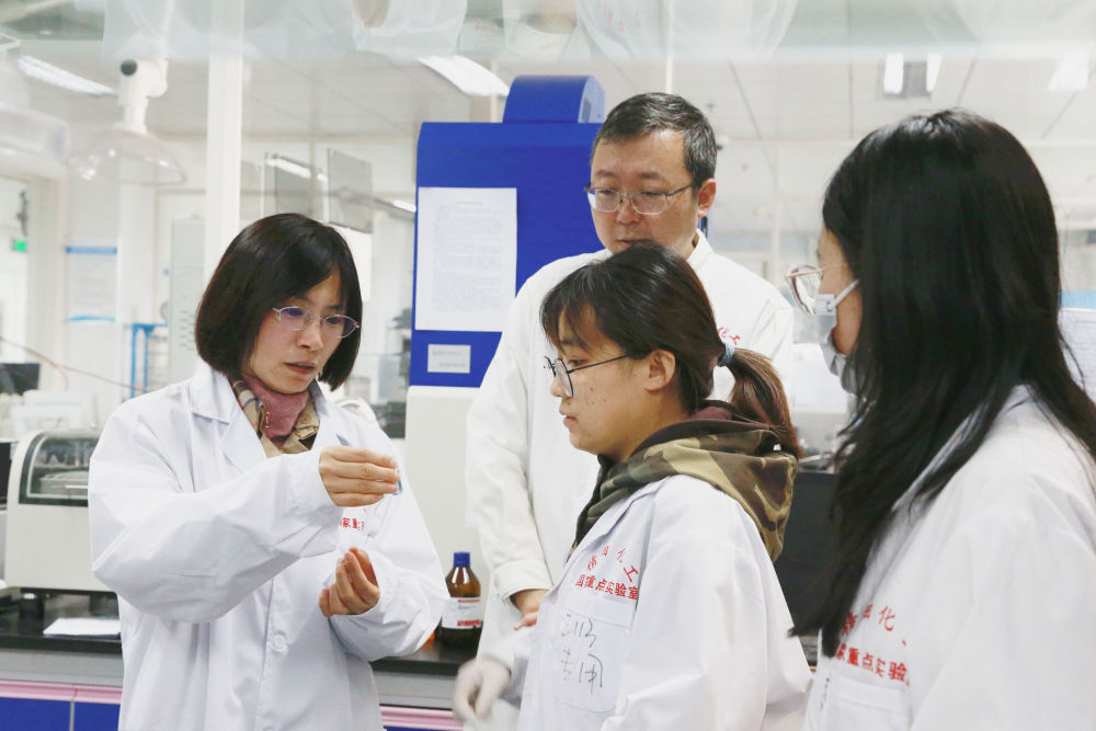 大連理工大學化工學院樊江莉(左)教授與同事及學生查看實驗結(jié)果(2021年11月攝)。新華社發(fā)