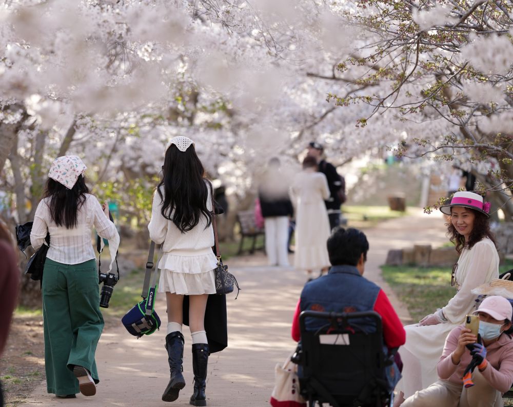 2024年4月17日,游客在遼寧省大連市龍王塘櫻花園內賞花、游覽。 新華社記者 李鋼 攝