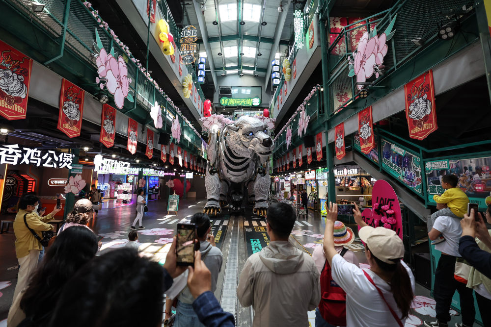 大連熊洞街,當身高6米、重達25噸,灰色的仿生機械巨熊時而張口咆哮,時而緩緩前行,游客爆發出陣陣歡呼。大連冰山慧谷發展有限公司總經理助理藍費靜說:“這一街區由擁有近百年歷史的大連冰山集團舊址改造而來,現已匯聚上百家游樂、電玩、研學商戶,老廠房煥發了新生機。”