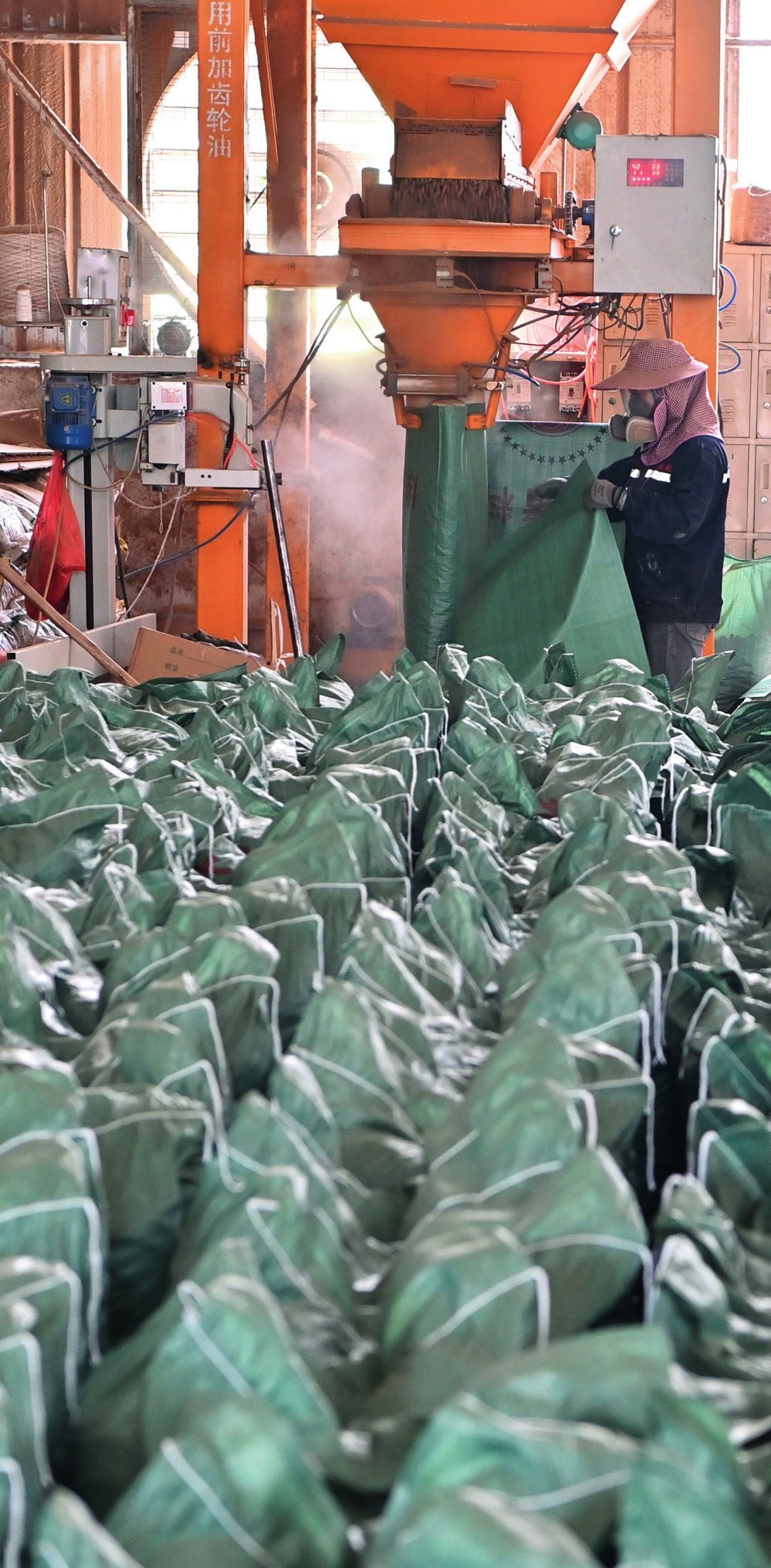 工作人員在廣西來賓小平陽鎮一家飼料廠將甘蔗葉為主要原料的飼料裝袋(2023年12月12日攝)周華攝