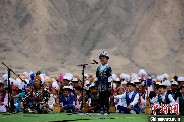 近日,2024年新疆阿合奇縣獵鷹文化旅游季拉開帷幕,現場小瑪納斯奇傳承人為觀眾說唱《瑪納斯》。陶拴科 攝